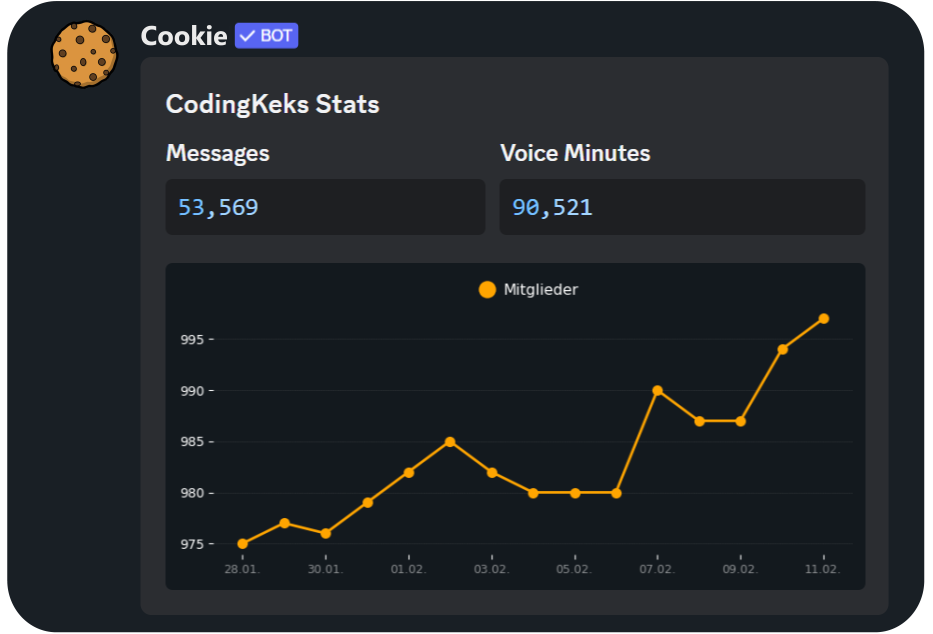 Cookie provides detailed statistics and leaderboards for text and voice activity.